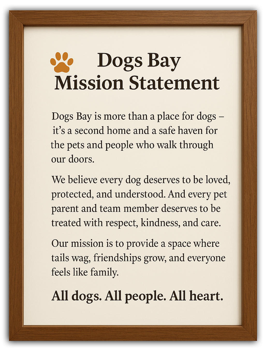 We would like to extend our personal guarantee, that whether you are taking advantage of Dogs Bay’s boarding, doggie daycare, grooming or pet sitting services, from the moment you walk through our doors… your dog is considered part of our family too!!